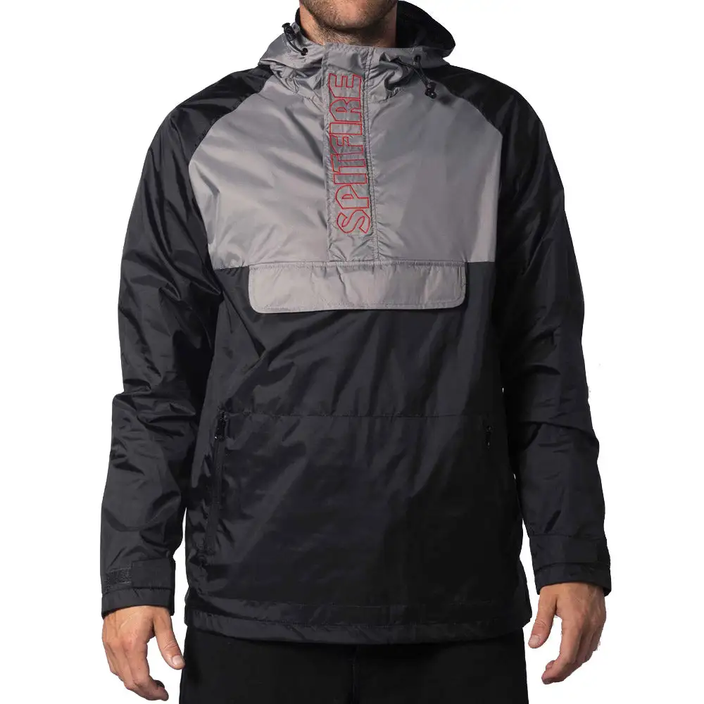 A classic fit windbreaker jacket in black with silver and red. It folds up into it’s own pouch.
